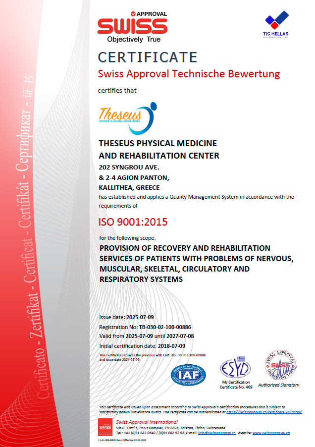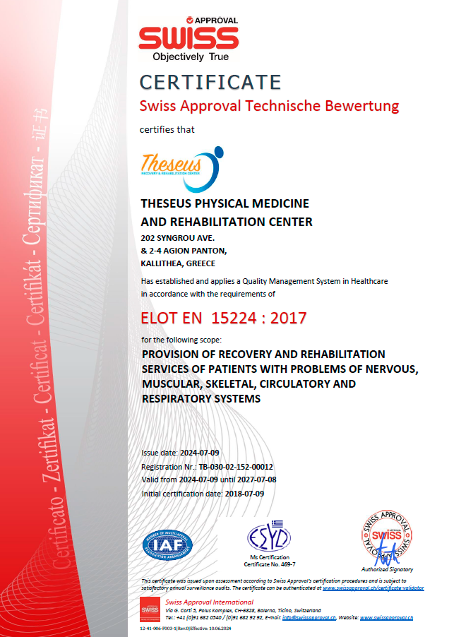 KAA Theseus is certified according to the International Standards ISO 9001: 2015 and EN 15224: 2017, emphasizing the quality of the care that the patient must receive, ensuring the high level of services provided by the Rehabilitation Center and the commitment of staff and management for the personalized and holistic approach, based on the real needs of patients.